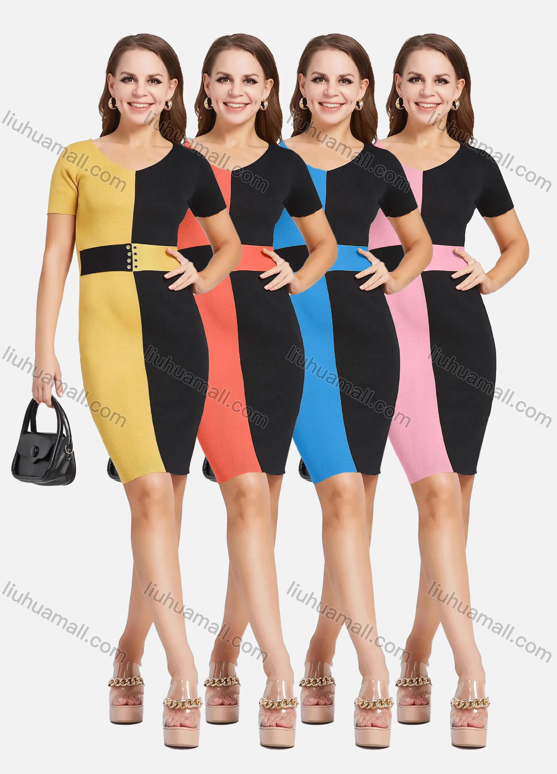 Wholesale Women's Elegant V Neck Short Sleeve Colorblock Slim Fit Knit Short Pencil Dress 2111#