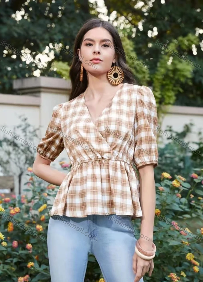 Wholesale Women's Elegant Wrap V Neck Half Sleeve Plaid Ruffle Hem Blouse AY077#