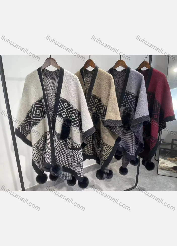Wholesale Women's Fashion Casual Tribal Patch Pockets Pom Pom Shawl