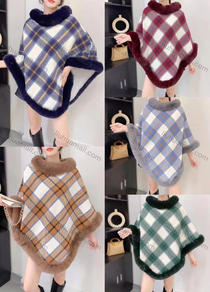 Wholesale Women's Fashion Causal Fuzzy Collar Thermal Gingham Cape