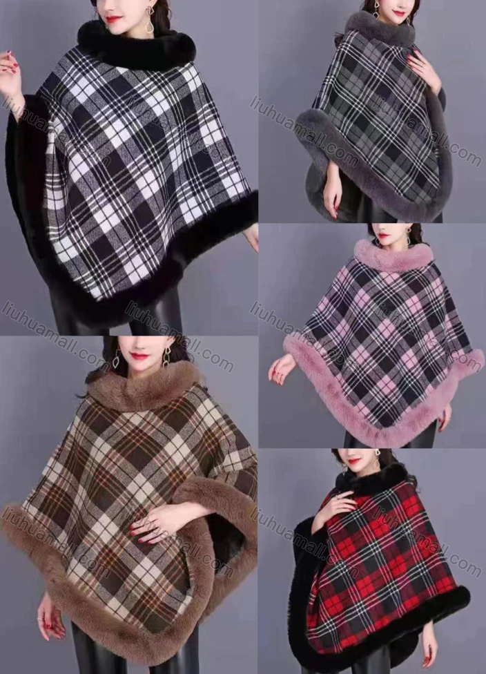 Wholesale Women's Fashion Causal Fuzzy Collar Thermal Gingham Cape