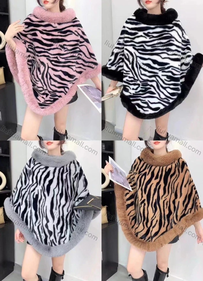 Wholesale Women's Fashion Causal Fuzzy Collar Thermal Zebra Stripe Cape