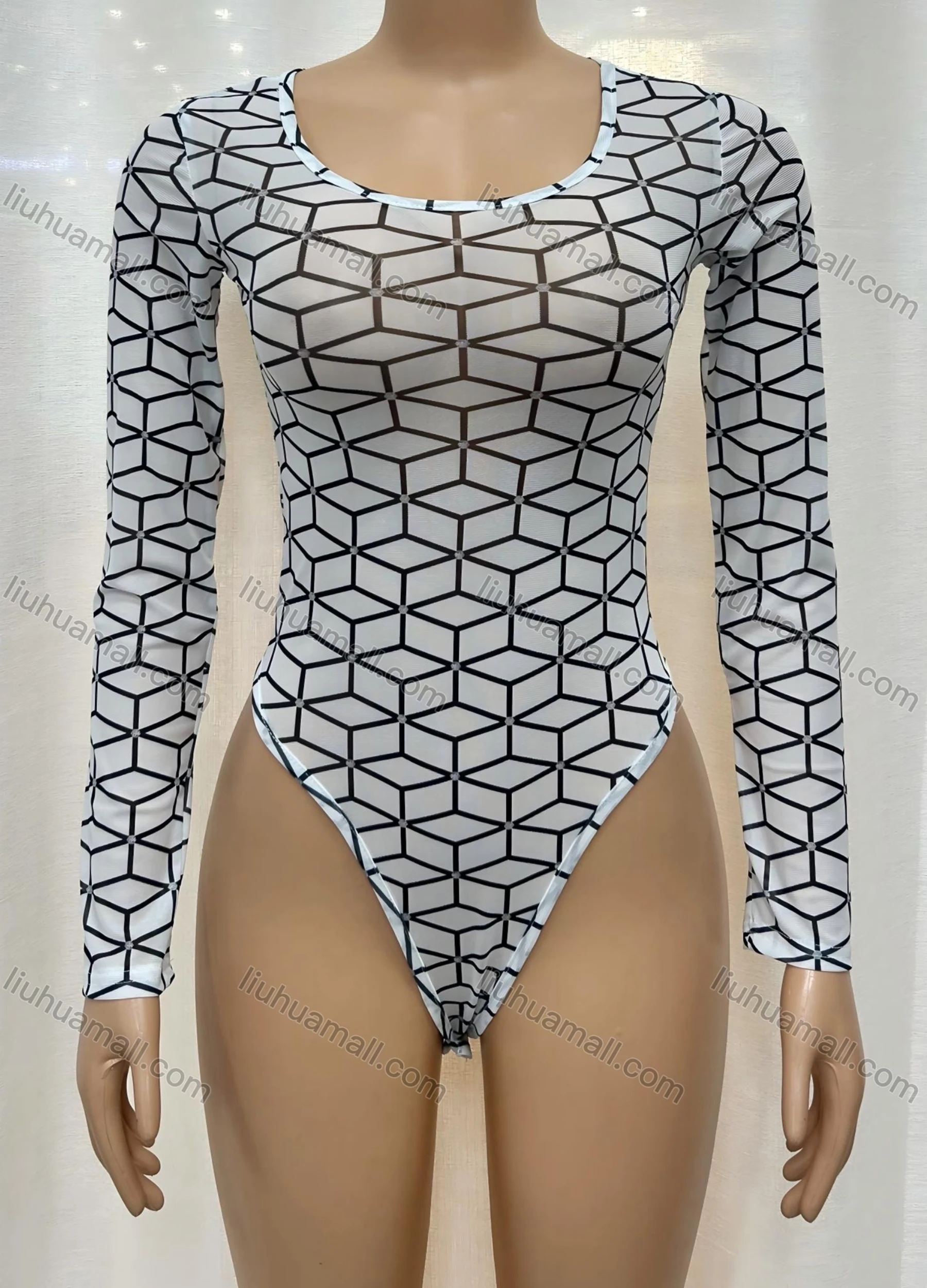 Wholesale Women's Fashion Korean Net Translucence Crew Neck Unisize Plain Long Sleeve Bodysuit 10745-1#
