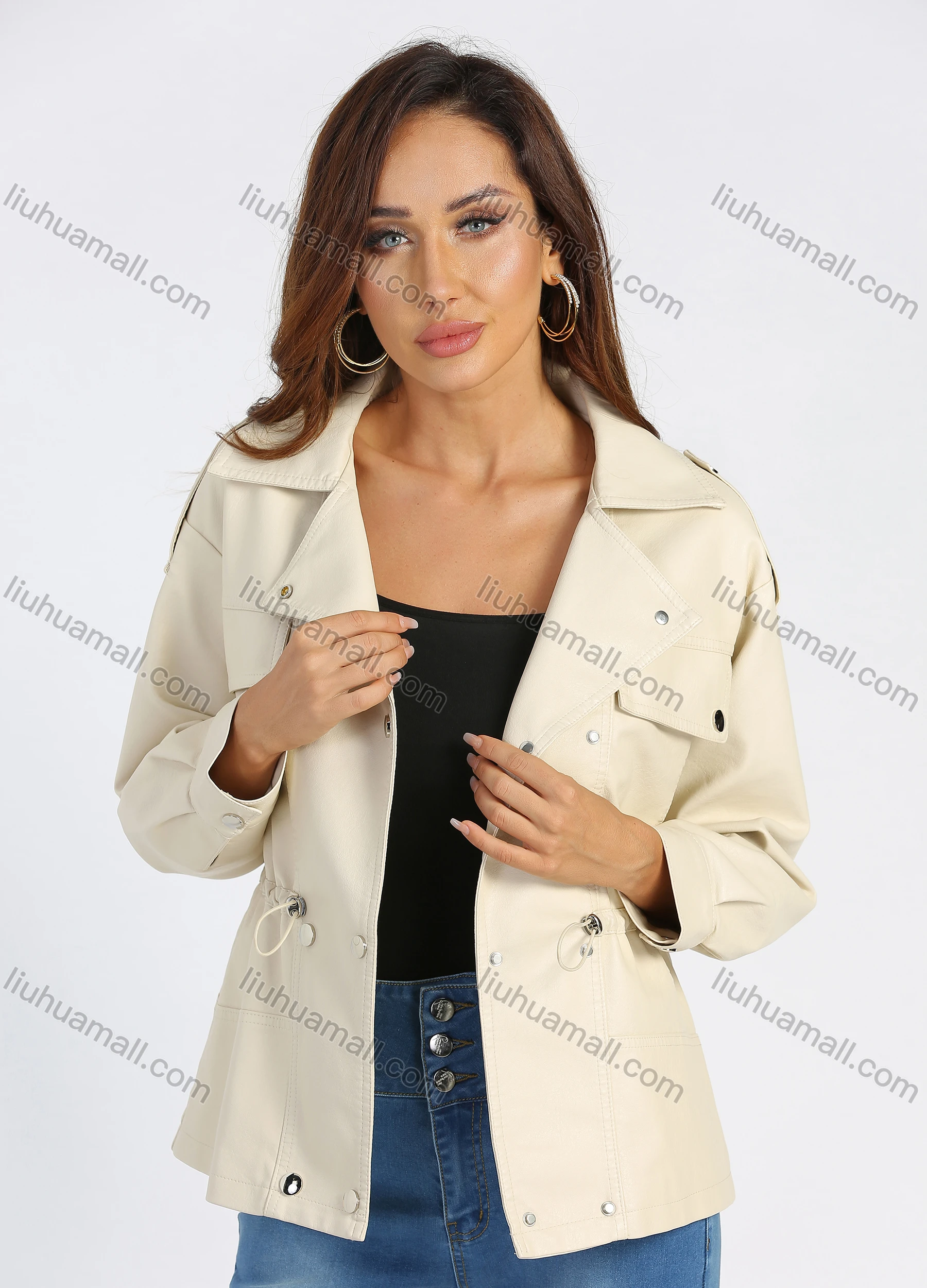 Wholesale Women's Fashion Lapel Button Closure Drawstring Leather Jacket