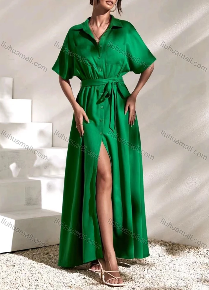 Wholesale Women's Fashion Plain Button Front Short Sleeve Split Maxi Shirt Dress With Belt