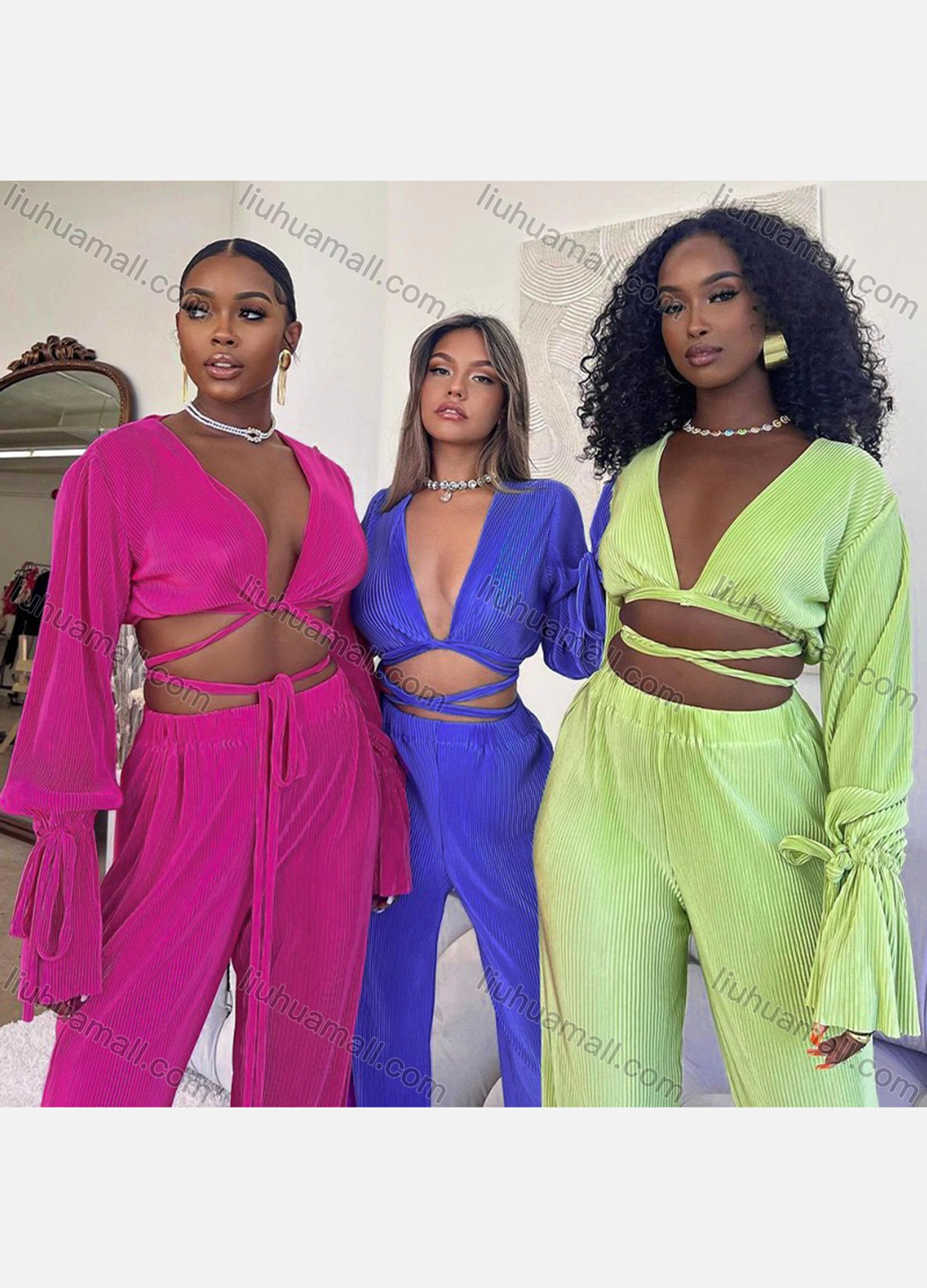 Wholesale Women's Fashion Plain Wrap V Neck Long Sleeve Lace Up Top & High Waist Ruffle Leg Ankle Length Pants 2 Piece Set