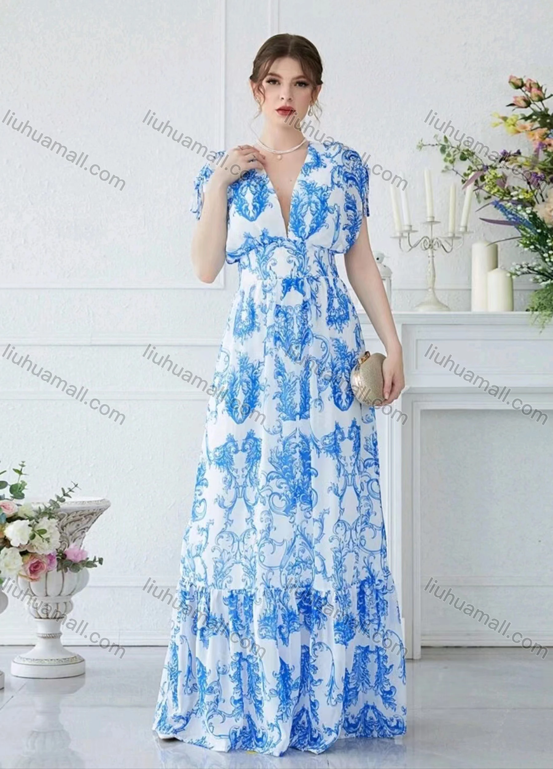 Wholesale Women's Floral Print V Neck High Waist Floor Length Cocktail Tank Dress