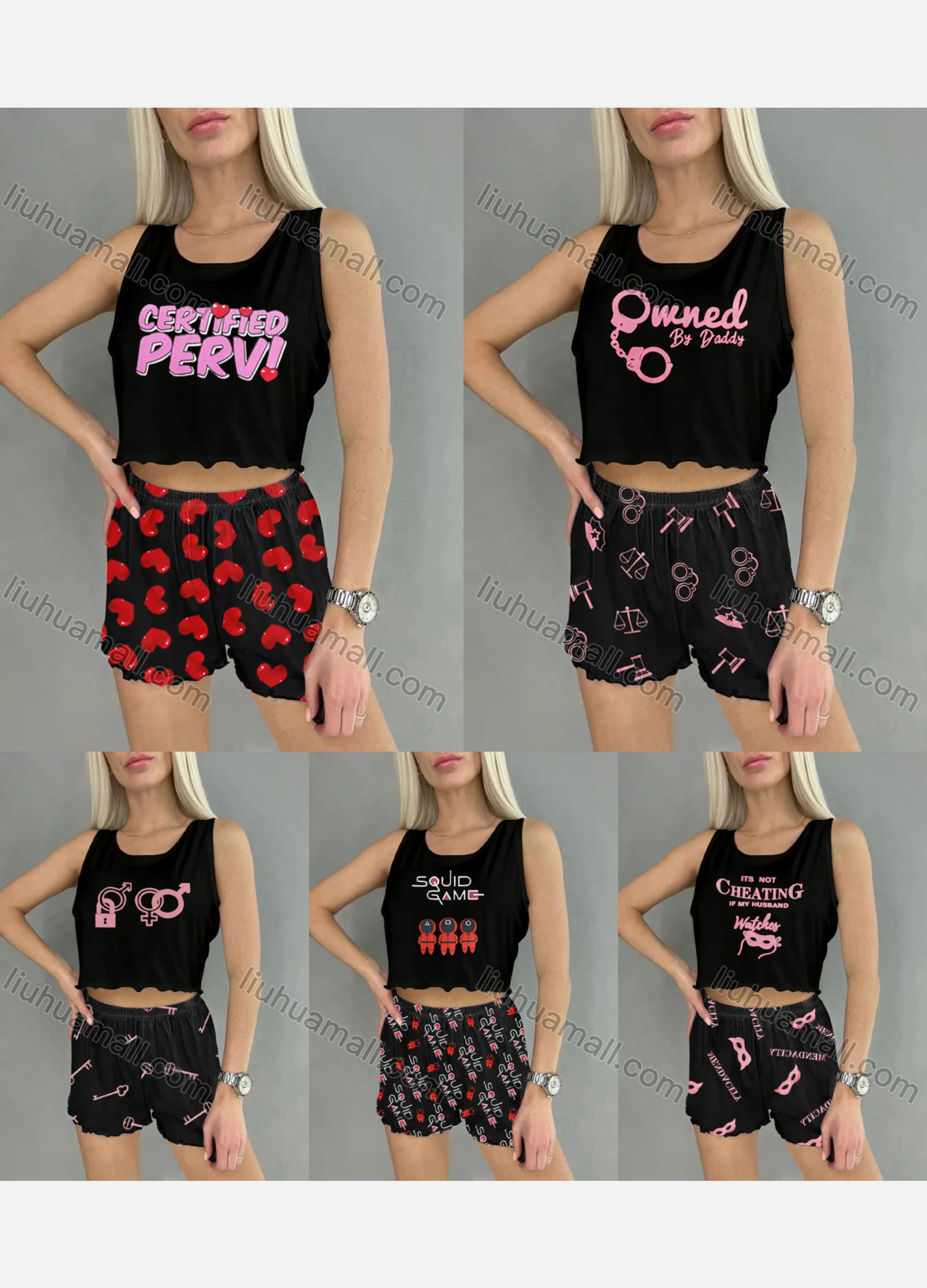 Wholesale Women's Graphic Ruffle Trim Crop Cami Top & High Waist Allover Print Shorts 2 Piece Pajamas Lounge Set 75101#