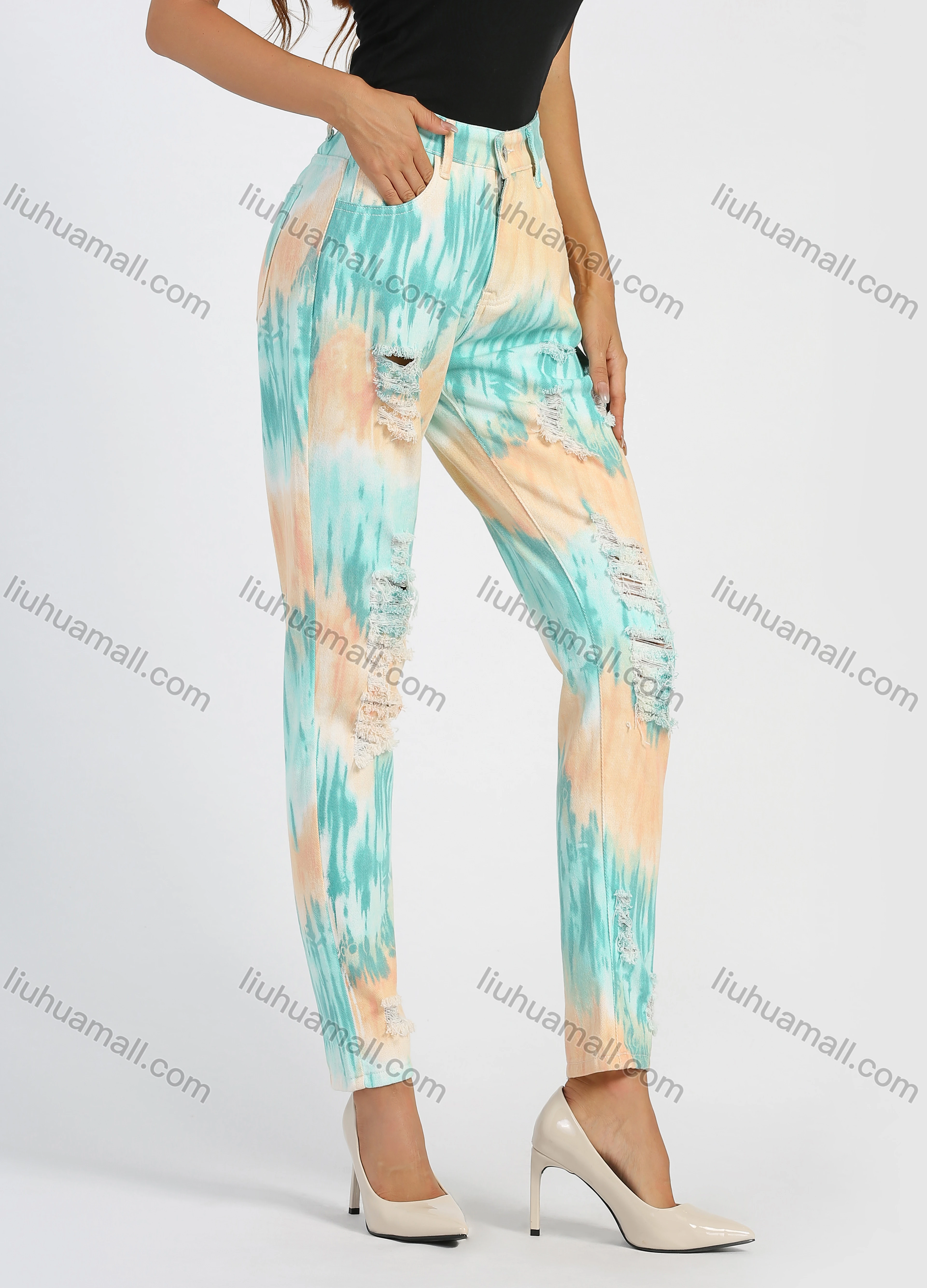 Wholesale Women's High Waist Tie Dye Ripped Distressed Patch Pocket Skinny Pant