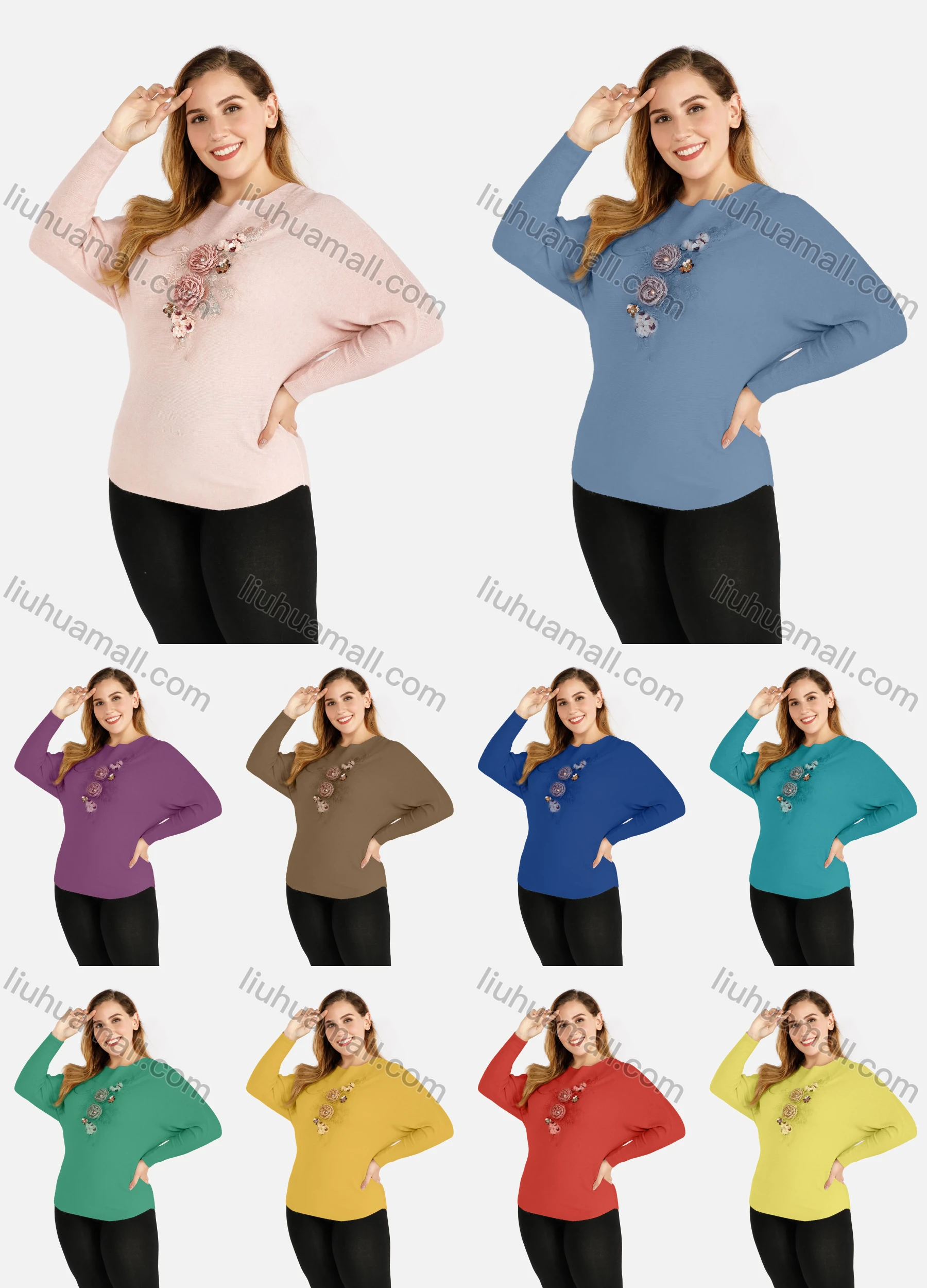 Wholesale Women's Lace 3D Floral Appliques Round Neck Long Sleeve Pullover Knit Top