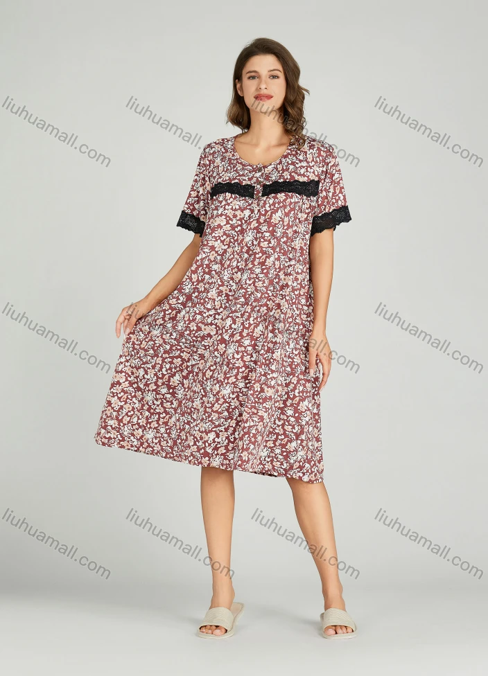 Wholesale Women's Lace Trim Allover Floral Print Milk Silk Lounge Short Sleeve Midi Night Dress 1149-1#