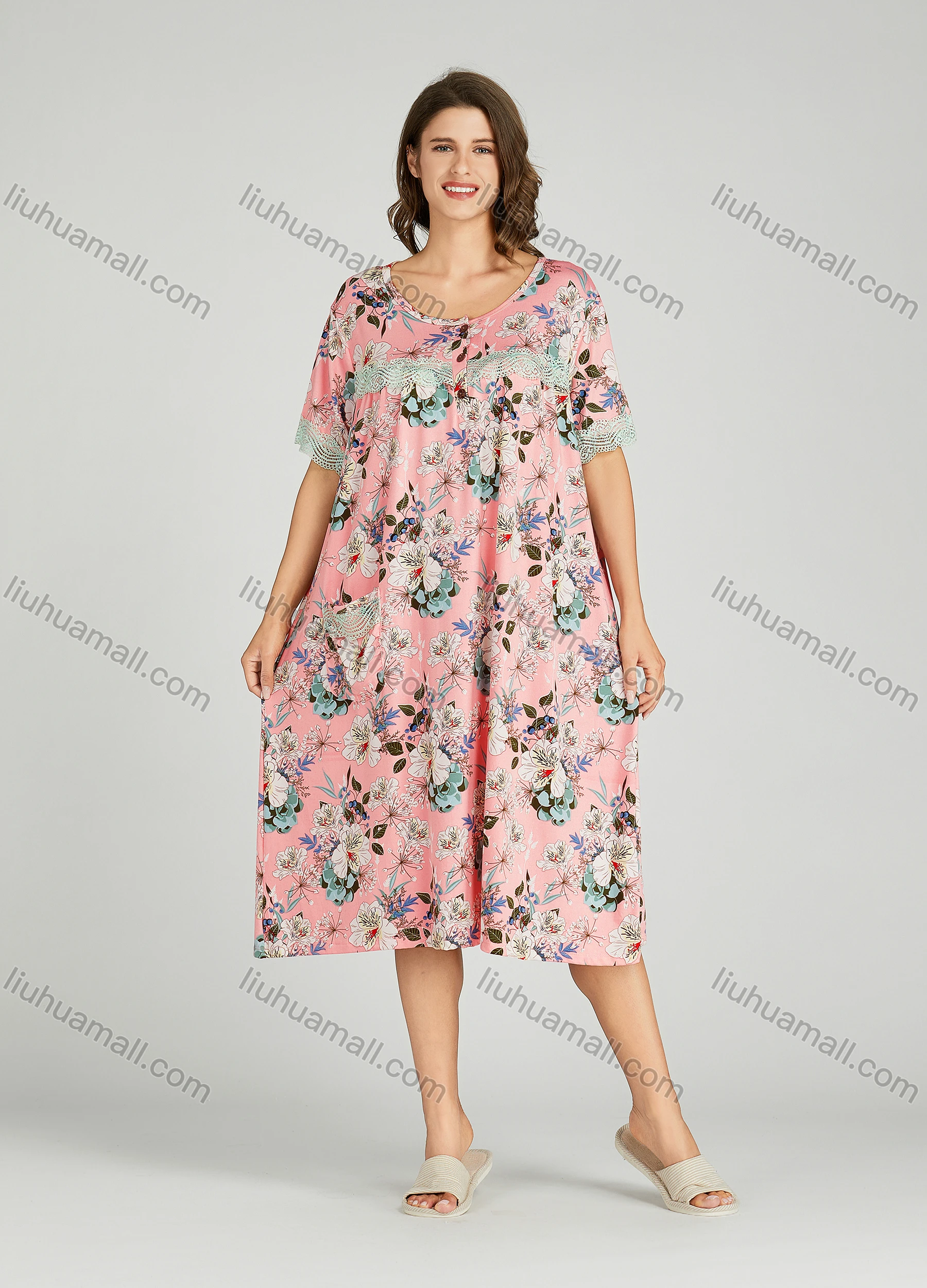 Wholesale Women's Lace Trim Allover Floral Print Milk Silk Pocket Lounge Midi Night Dress 1149-2#