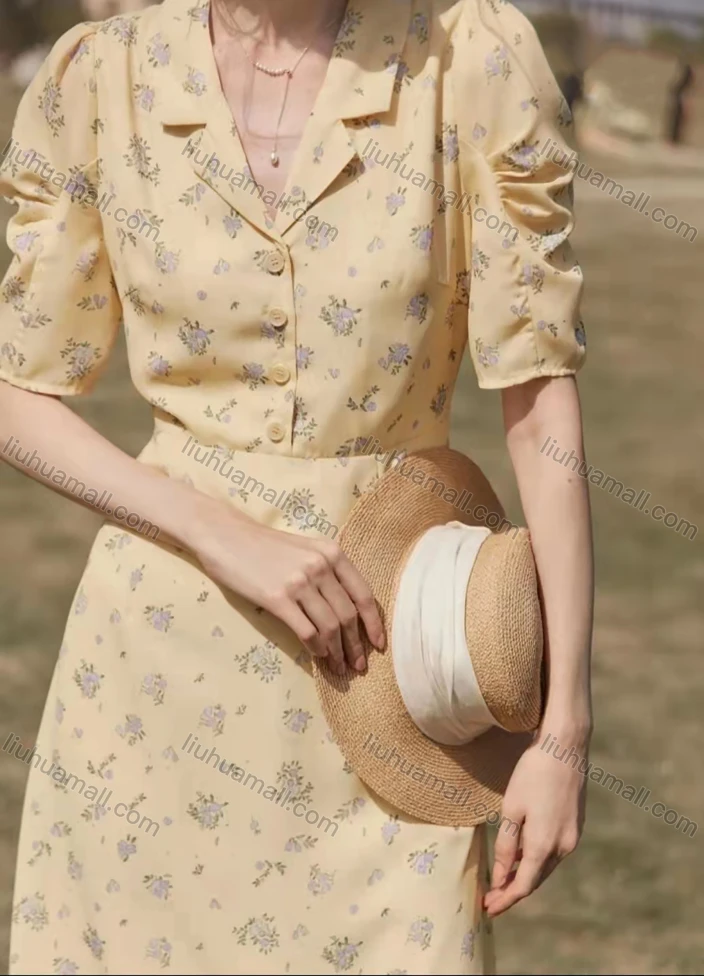 Wholesale Women's Lapel Puff Sleeve Floral Buttons Lace Up Back Short Shirt Dress AY135#