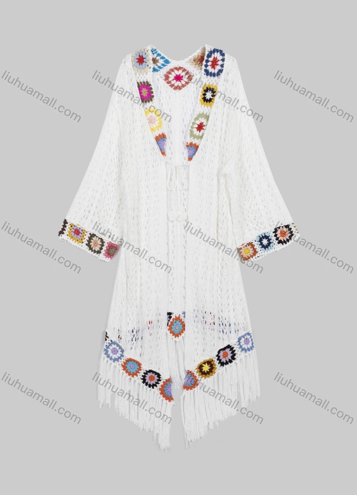 Wholesale Women's Long Sleeve Crochet Fringe Trim Lace Up Mid Length Knit Cardigans 203#