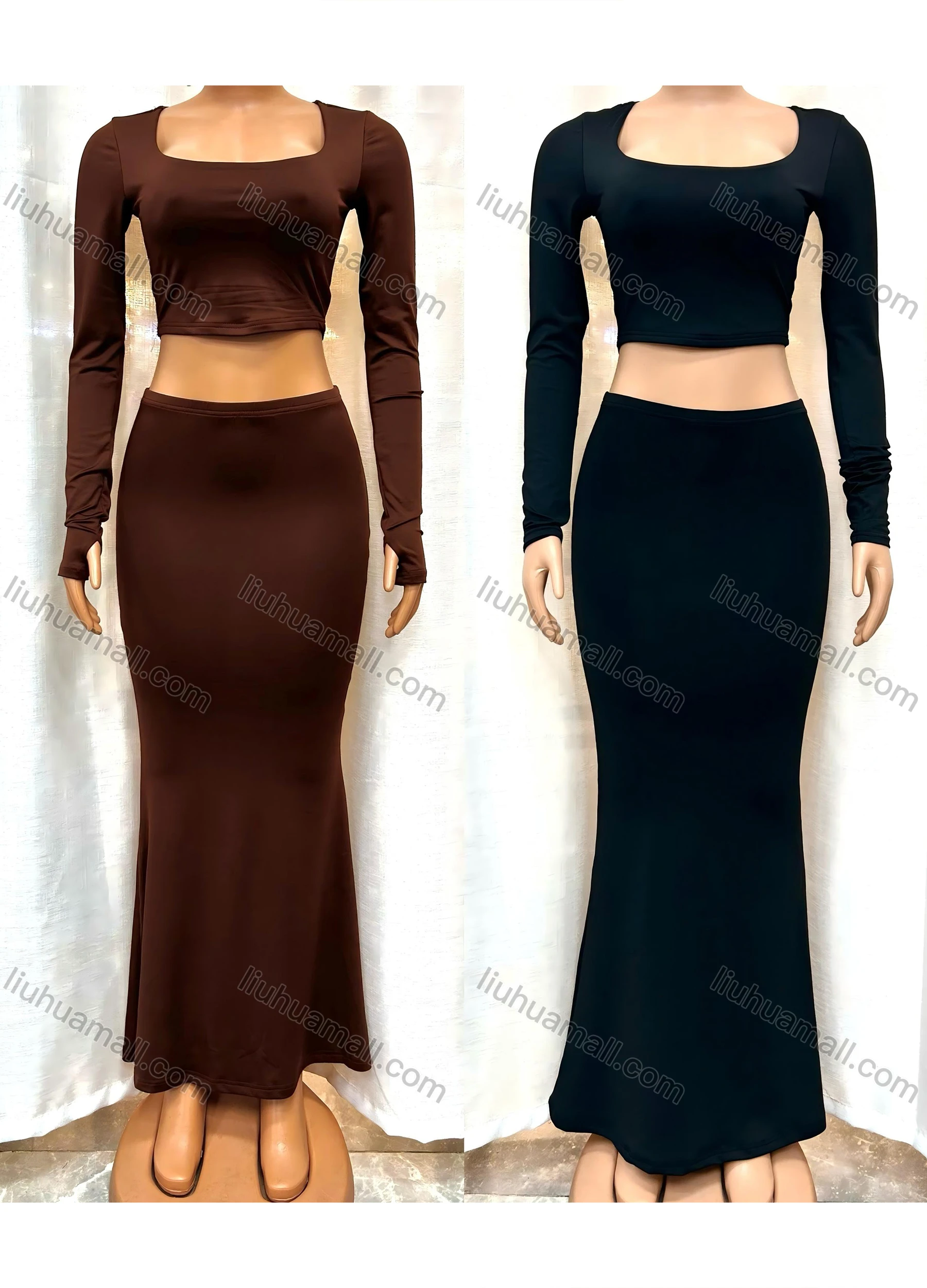 Wholesale Women's Milk Silk Plain Long Sleeve Slim Fit Crop Top With Pencil Skirt 2 Piece Set 11235#
