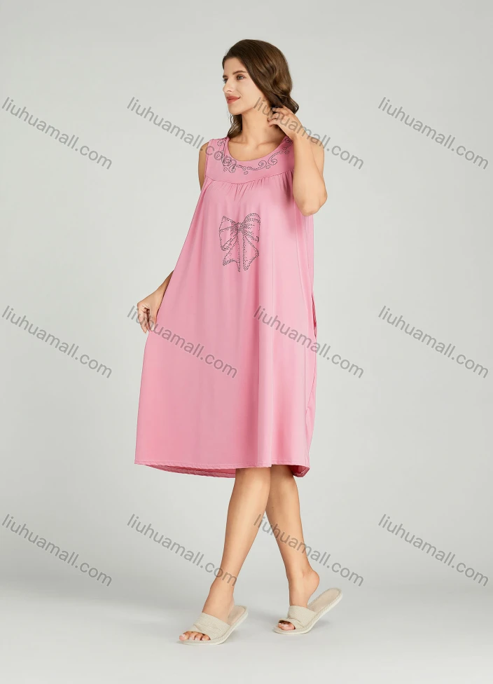 Wholesale Women's Milk Silk Plain Rhinestone Bowknot Crew Neck Side Pocket Ruched Lounge Midi Night Dress 1151#