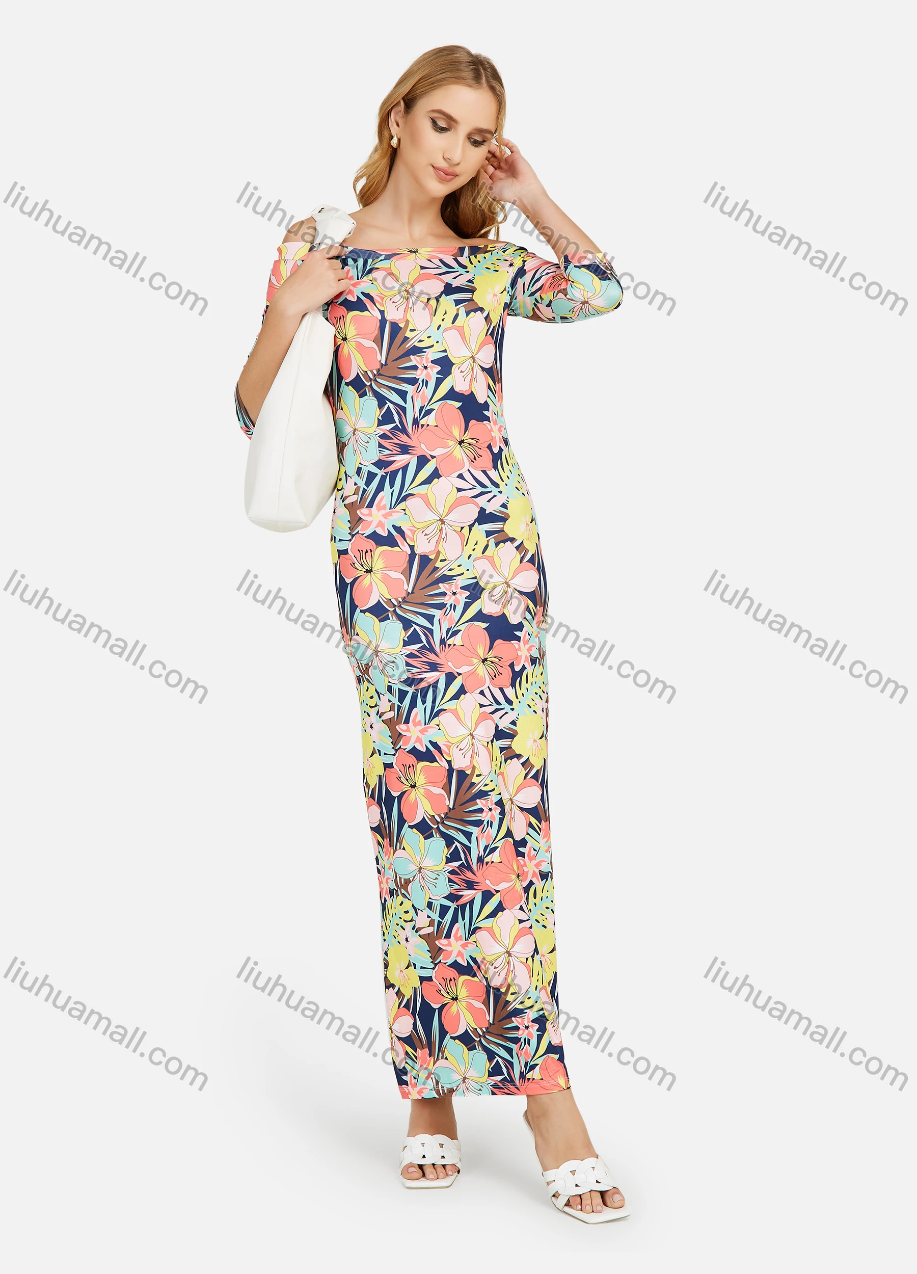 Wholesale Women's Off Shoulder Allover Floral Print 3/4 Sleeve Slim Fit Casual Maxi Dress