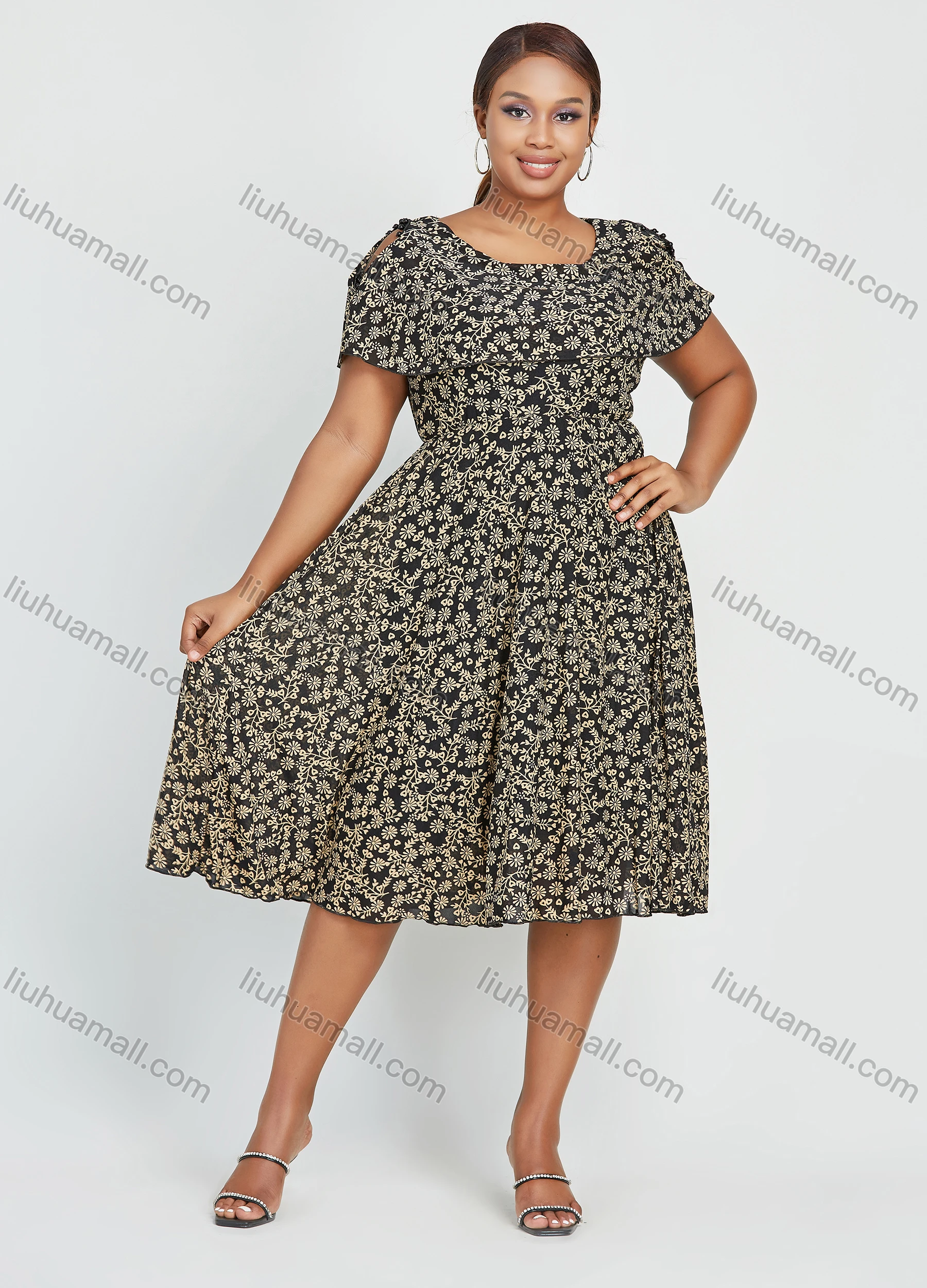 Wholesale Women's Plus Size Casual Cotton Round Neck Layered Short Sleeve Cutout Allover Floral Print Midi Dress