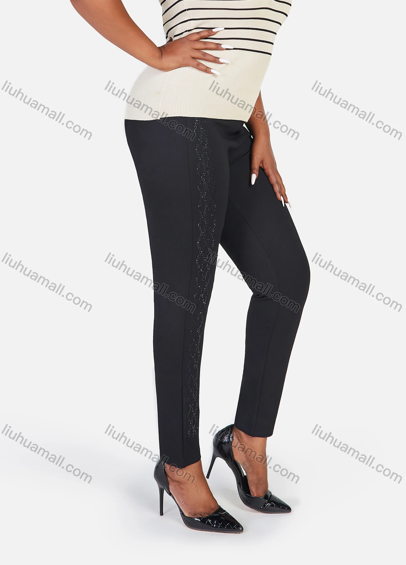 Wholesale Women's Plus Size Elastic Waist Rhinestone Plain Casual Straight Leg Pants