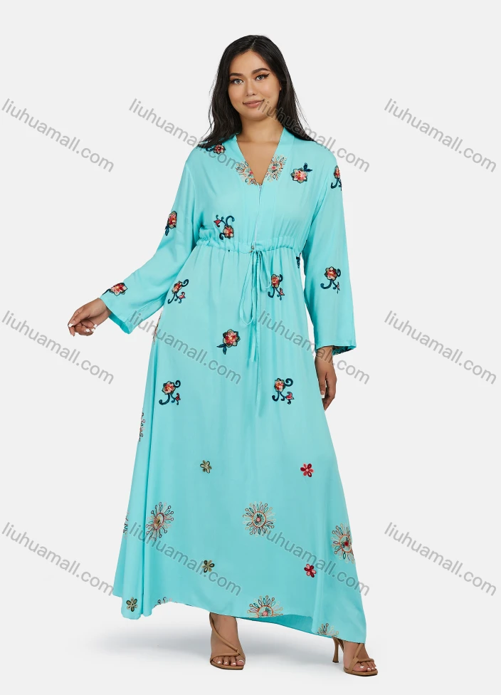 Wholesale Women's Plus Size Long Sleeve V Neck Drawstring Floral Print Zipper Front Maxi Dress