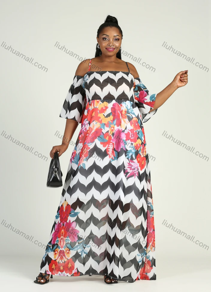Wholesale Women's Plus Size Spaghetti Strap Shirred Short Sleeve Floral Splicing Print Cold Shoulder Floor Length Dress