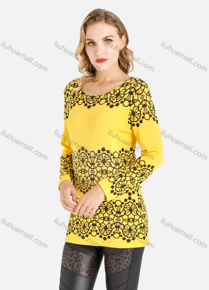 Wholesale Women's Round Neck Rhinestone Tribal Print Long Sleeve Casual Knit Top