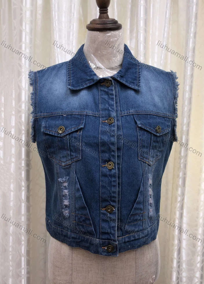 Wholesale Women's Round Neck Sleeveless Buttons Flap Pockets Casual Denim Shirt