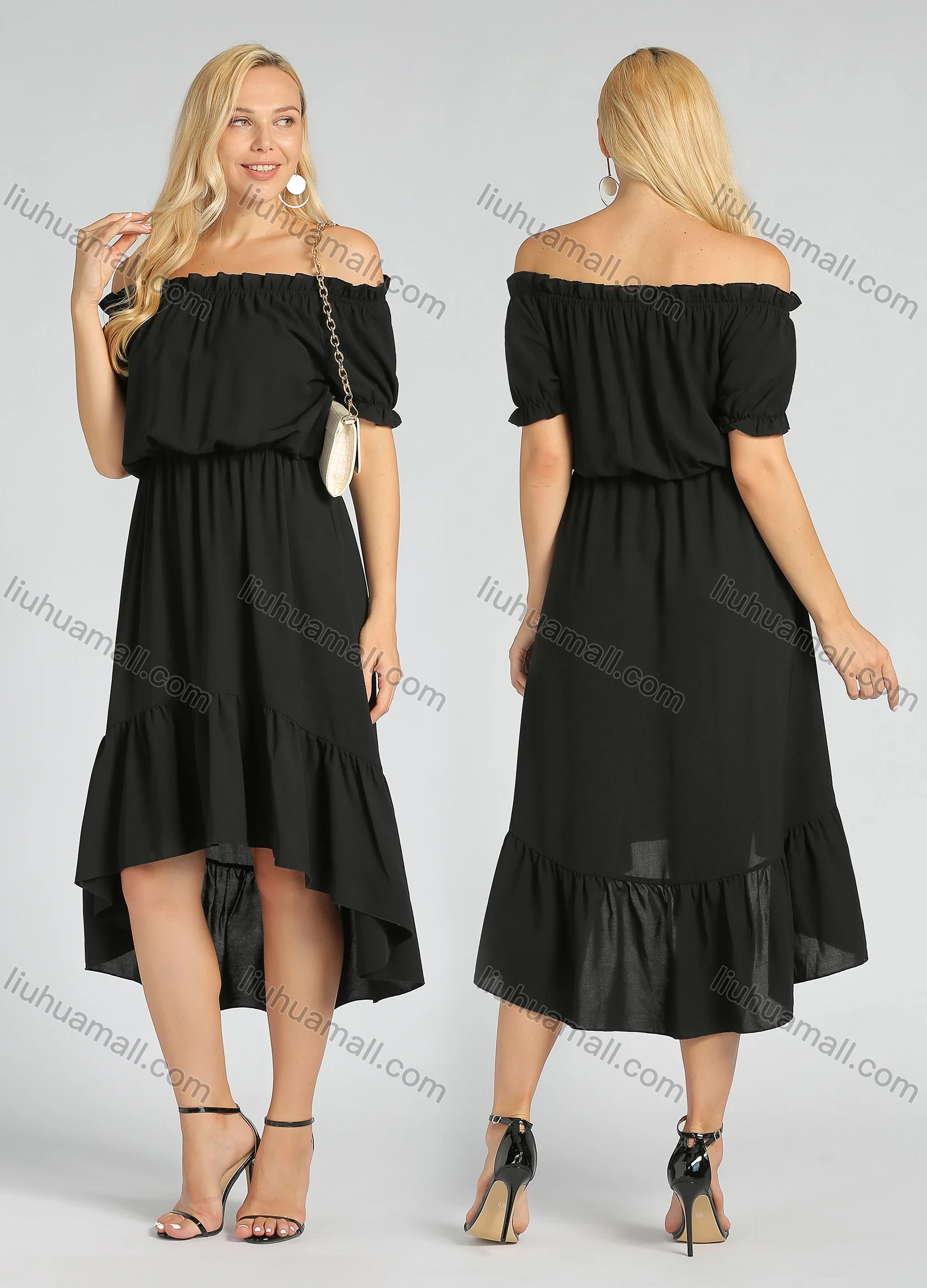 Wholesale Women's Ruched Off Shoulder High Waist High Low Hem Ruffle Trim Casual Midi Dress
