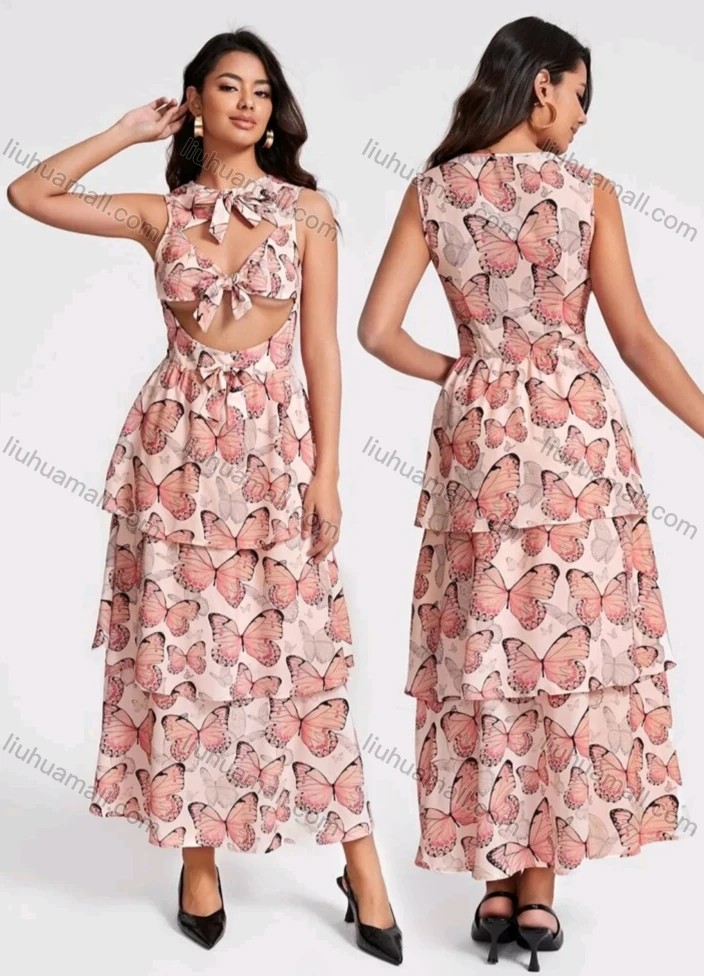 Wholesale Women's Sexy Butterfly Print Cut Out Bow Knot Tie Layered Ruffle hem Maxi Tank Dress