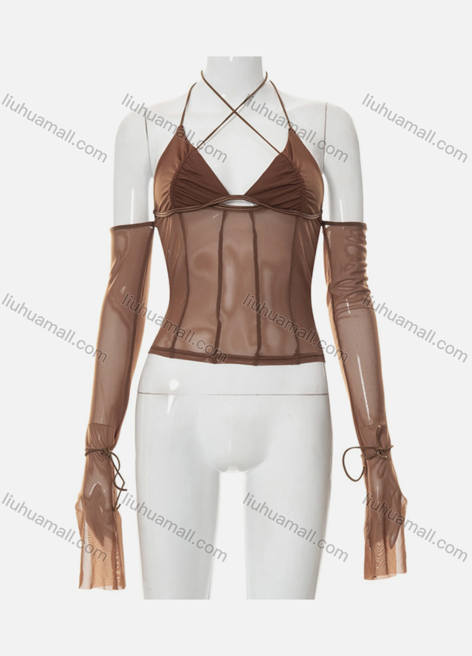 Wholesale Women's Sexy Plain Lace Up Sheer Mesh Backless Crop Halter Top Q20603T#
