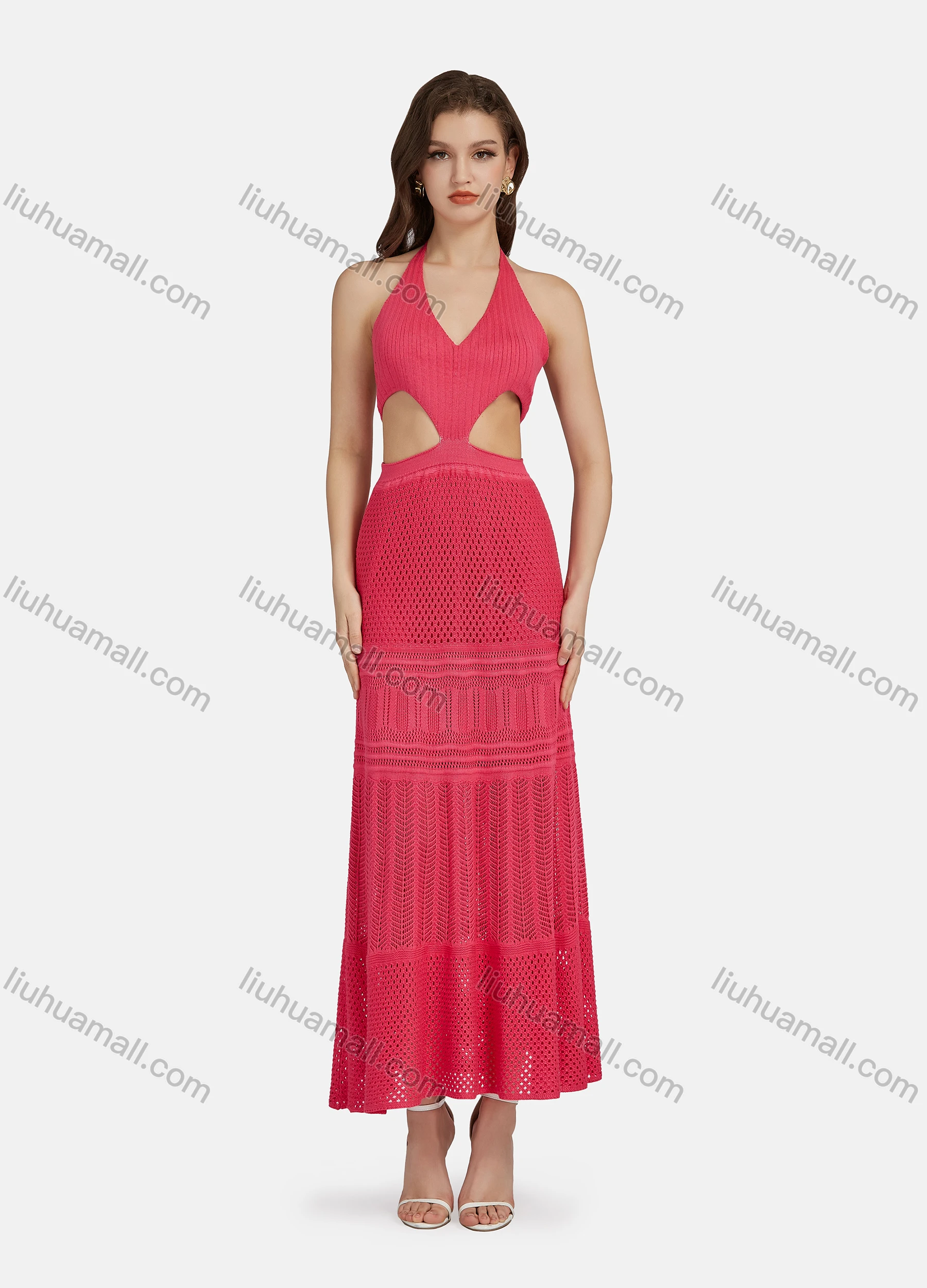 Wholesale Women's Sexy V Neck Cutout High Waist Plain Midi Halter Dress WK0055#