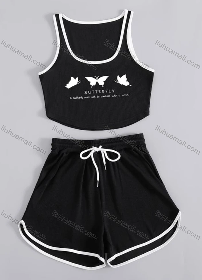 Wholesale Women's Sporty Contrast Curved Hem Tank Top & Drawstring Elastic Waist Shorts Set