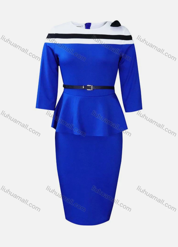 Wholesale Women's Striped Colorblock Round Neck Bowknot Bodycon Cocktail Midi Dress With Belt