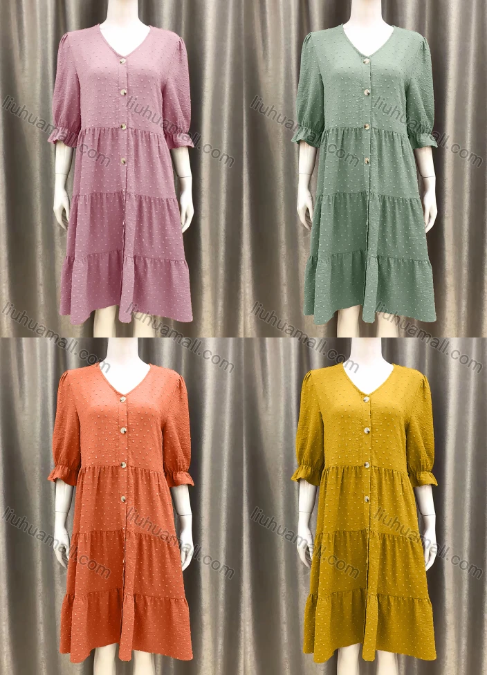 Wholesale Women's V Neck Button Front Swiss Dot Plain A-Line Dress