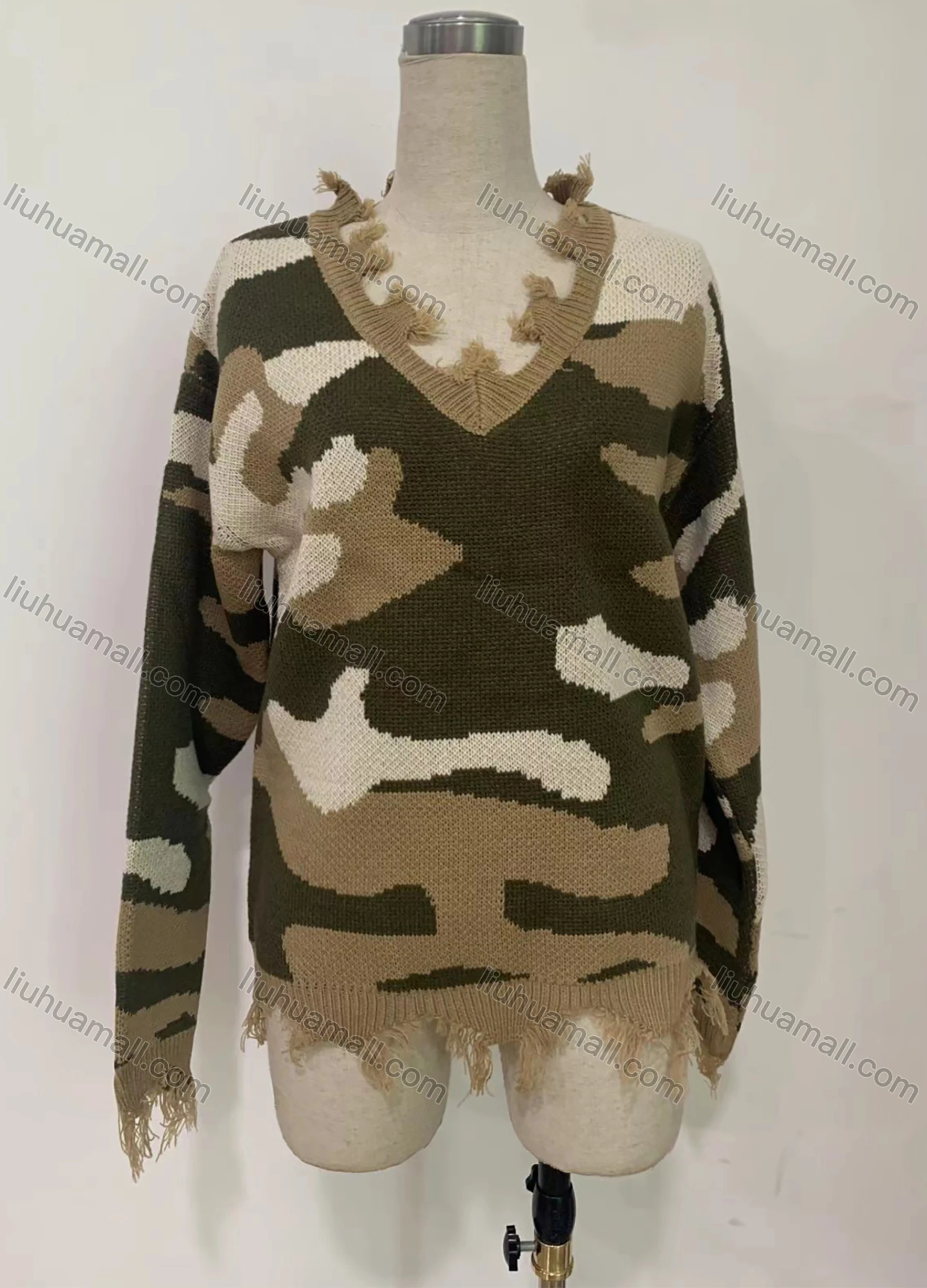 Wholesale Women's V Neck Frayed Raw Sleeve Camouflage Knit Sweater