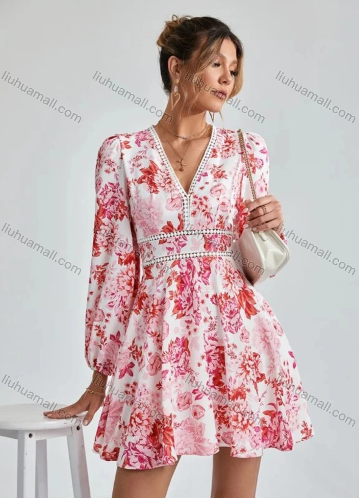 Wholesale Women's Vintage Long Sleeve V Neck Floral Print Short Dress