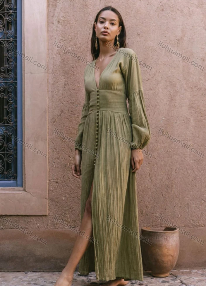 Wholesale Women's Vintage Plain Deep V Neck Button Down Split Hem Maxi Dress