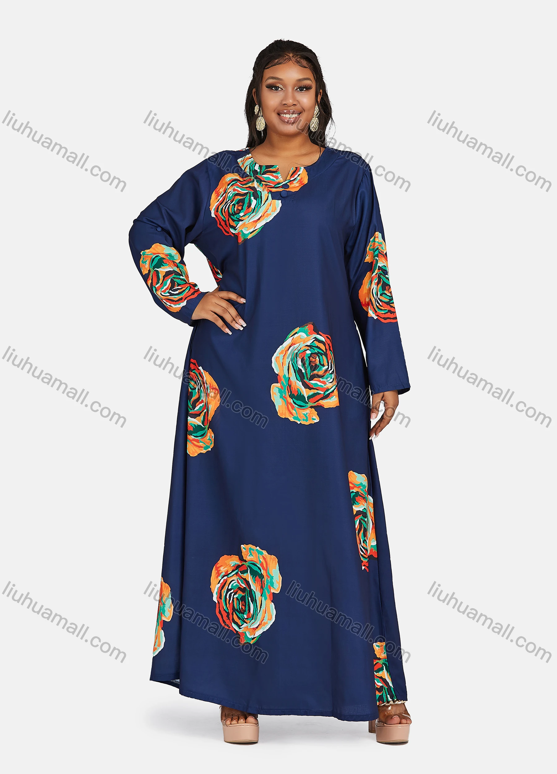 Wholesale Women's Vintage Plus Size Notched Neck Long Sleeve Floral Print Button Decor Maxi Dress