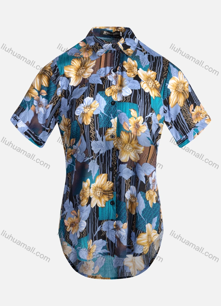 Wholesale Women's Vintage Short Sleeve Chevron Floral Pattern Collared Button Down Shirt 23050#