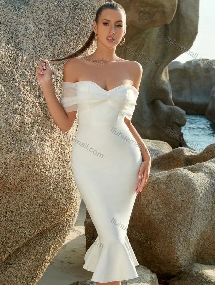 Wholesale Women's Elegant Fashion Plain Sheer Mesh Splicing Off Shoulder Ruffle Hem Bodycon Cocktail Evening Midi Dress