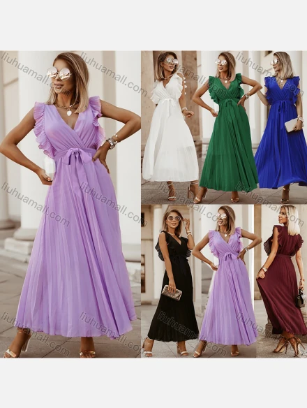 Wholesale Woman's Elegant Plain Wrap V Neck Ruffle Trim Pleated Ruched Maxi Dress With Belt