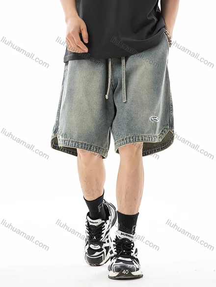 Wholesale Men's Fashion Plain Embroidered Label Distressed Slant Pocket Split Hem Drawstring Washed Denim Shorts