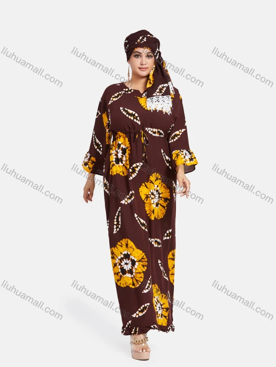 Wholesale Women's African 3/4 Sleeve Plus Size Tie Dye Floral Print Maxi Kaftan Dress With Turban ZXV-630D2#