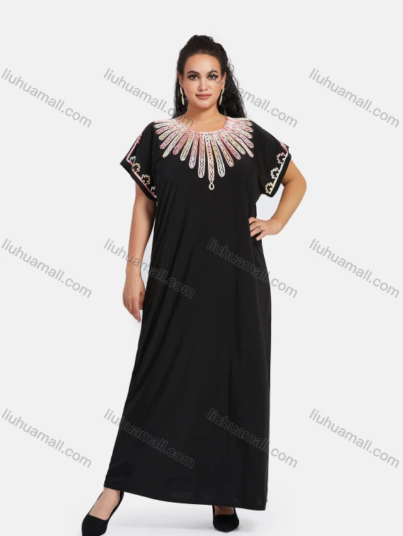 Wholesale Women's African Short Sleeve Floral Embroidery Round Neck Maxi Kaftan Dress #300